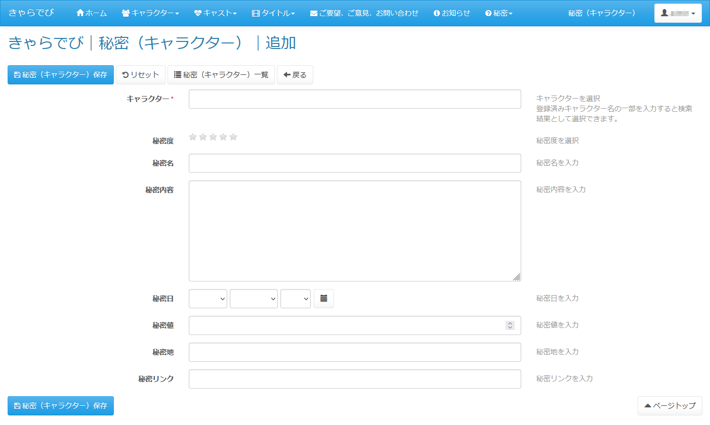 【入力画面】 キャラクターやキャスト、タイトルのそれぞれに 下図のような秘密メッセージを入力する画面が用意されています。 使い方はいろいろ・・・、 キャラクターのお気に入り度を星の数で入力したり イベント開催日やフィギュアの発売日などをメモしたり。